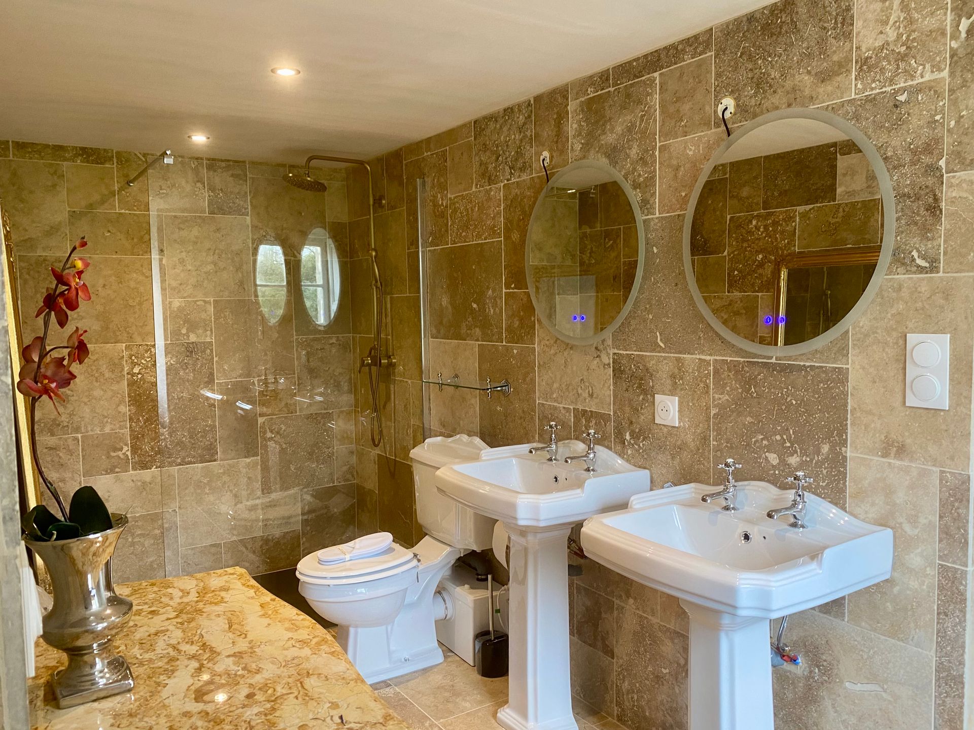 Im Badezimmer: Natürliche Atmosphäre mit der Sanftheit von Travertin, gepaart mit der Eleganz stilvoller Möbel mit dem Komfort einer großen begehbaren Dusche, zwei Waschbecken und einer Toilette.
