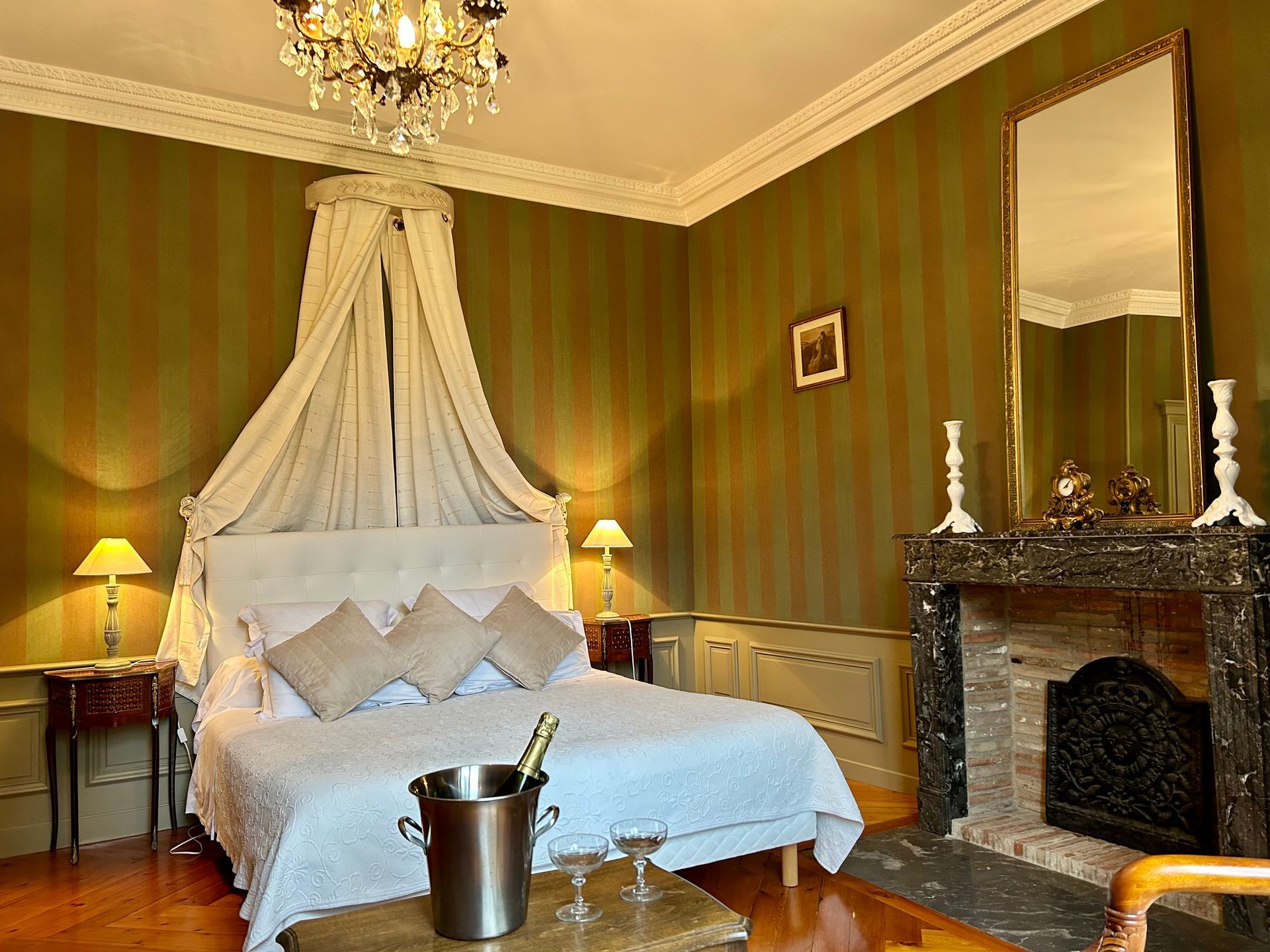 Charming room equipped with a Queen Size bed (160/190cm) with Louis XVI fireplace and low woodwork offering a view of the park behind beyond the moat and the balustraded sleeping bridge. In the background the woods of the estate which guarantee you great calm.