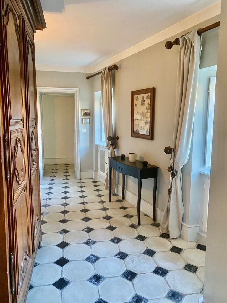 Kamer op de begane grond van de 19e-eeuwse vleugel met grote ramen waaronder een openslaand raam met uitzicht op de achterterras van het kasteel waar in het seizoen tuinmeubilair aanwezig is met uitzicht op de volière en het bos in de verte. Authenticiteit van Tomettes, open haard en bibliotheek maar comfort van Queensize bed 160cm bij 200cm.